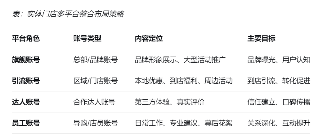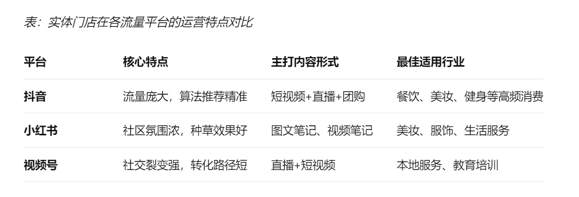 不同流量平台有着不同的用户画像和内容特性,实体门店需根据自身业态和目标客群,制定 差异化的平台策略 。餐饮、娱乐等高频消费服务可重点布局抖音;美妆、服饰、生活服务等注重体验的业态可加大小红书运营力度;而依赖本地客群和熟客经济的门店则可深耕视频号。